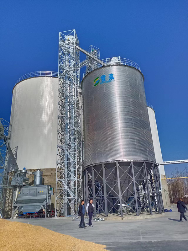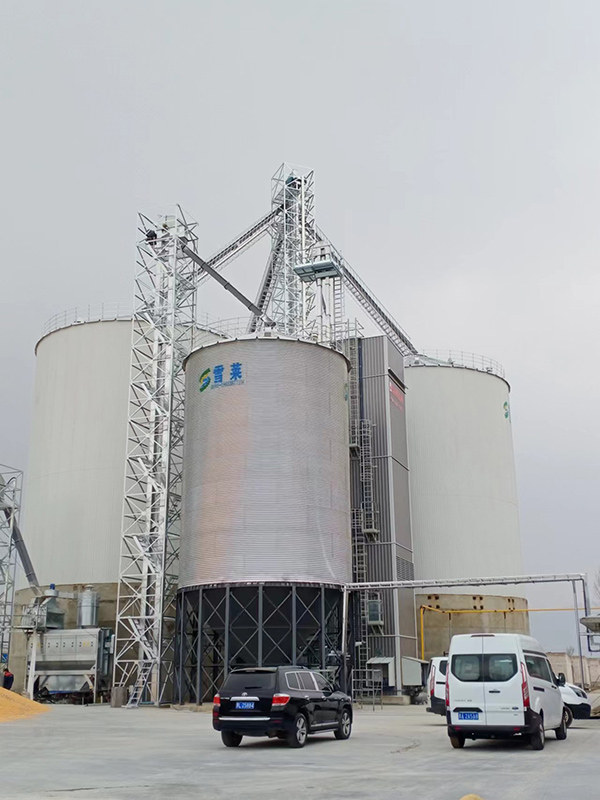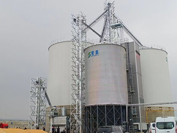 山西大同匯豐農業進口烘干塔搭配雪萊3臺2000T水泥錐底保溫鋼板倉+1-500T全鋼錐底暫存倉投產運行中
