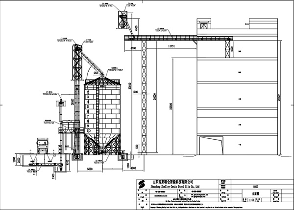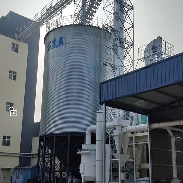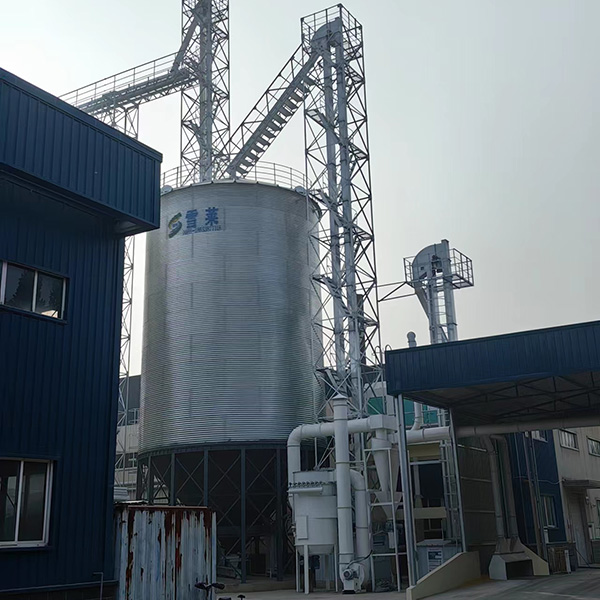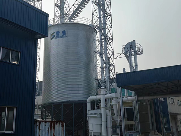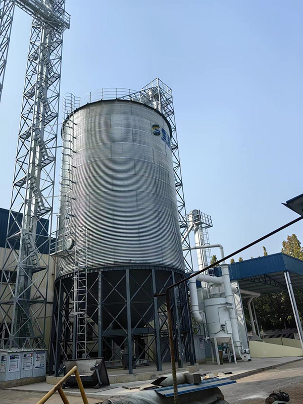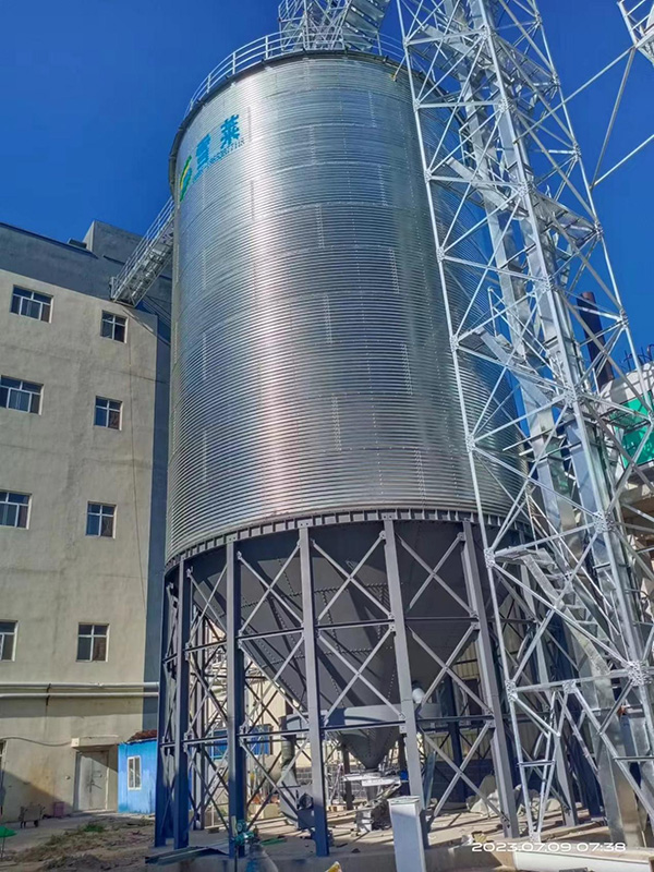 500T鋼板倉容積710立方米,直徑8.2米,層數10層,倉檐高16.2米,總高18.3米;鋼板倉錐頂角度25度。全部鍍鋅板采用國產優質鍍鋅鋼板,鍍鋅層均為275g/㎡。錐底鋼板倉倉頂包括護欄,人孔,自然通風窗,倉頂簡易爬梯,錐底鋼板倉倉筒包括內外爬梯,倉門,倉門平臺。錐底鋼板倉錐底板,環梁,拉筋,柱腳噴漆處理。
