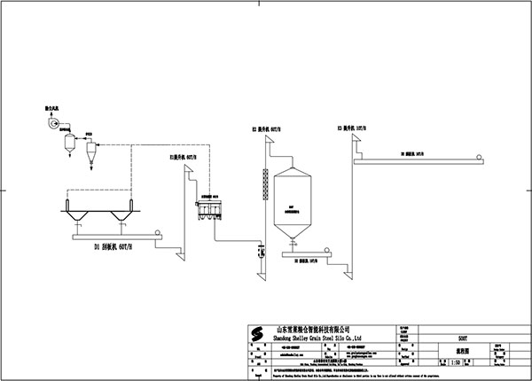 本項目為1-500T錐底鋼板倉,項目采用兩側卸車篦子承重的方式,進出倉工作流程為糧食經卸糧坑底部刮板機輸送進到提升機,提升機將糧食提升至到圓筒篩中,篩子將糧食中的大小雜質清理后通過倉前提升機將糧食提升進筒倉中。錐底鋼板倉配合倉底閘門的開合通過刮板機將糧食輸送到提升機,提升機將糧食提升通過架空刮板機輸送進入到車間進行加工。